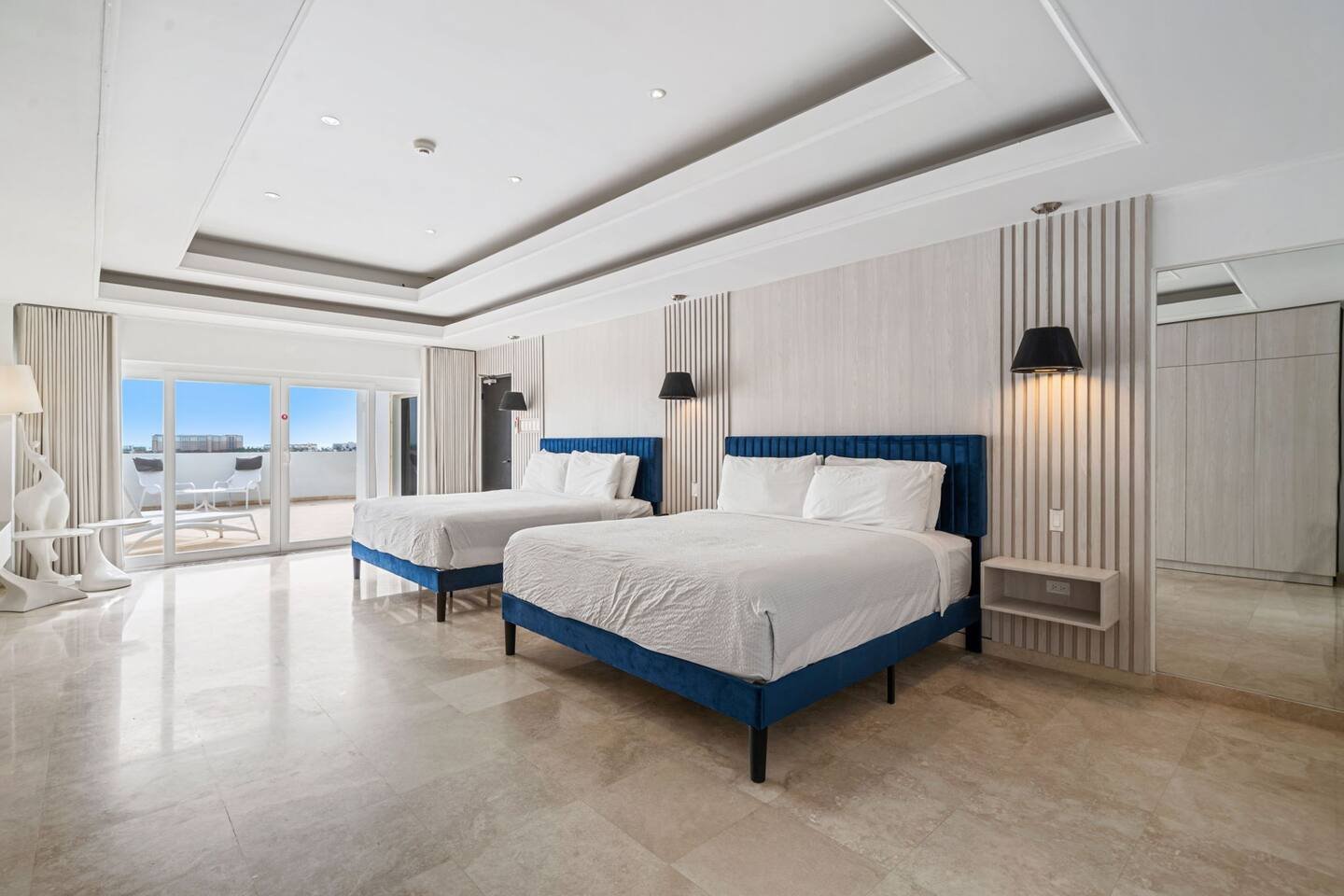 Bedroom 6 is ideal for friends or families, featuring two comfortable king beds, a smart TV, and an attached bathroom with a walk-in shower. Bedroom 5 also offers direct access to the third floor balcony, which offers beautiful pool views.